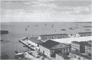 Ao centro o atual Mercado Modelo. Nessa época era a Alfândega. Não existia ainda o quebra-mar. À direita da Alfândega vê-se parte do prédio que estamos tratando. Existia outra igual à sua direita, bem ao seu lado. Foi reduzido, ou fizeram outro ou juntaram os dois. A parte aterrada em branco, após os armazéns, era toda ocupada por prédios do mesmo estilo pombalino. Botaram abaixo para a construção das Avenidas da França, Estados Unidos e Miguel Calmon. Há de se reparar ainda, que atrás da antiga Alfândega, existia um armazém. O porto começava ali. Nota-se também os primeiros guindastes. Outra referência interessante é a fileira de pequenos prédios em frente ao atual Mercado Modelo, verticalizados em relação a ele. Em frente a essa fileira de casas, um imóvel de dois andares.