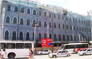 A Praça Visconde de Cayru é pródiga de atrações. Vimos há pouco o Mercado Modelo, o novo. Fica na praça, aos fundos. O antigo também ficava na praça, à esquerda do Elevador Lacerda, que também é da praça. À direita um dos prédios mais tradicionais de Salvador, construído em estilo pombalino, fachada toda revestida de azulejos importados e suas 60 janelas de frente. Tem mais algumas nas laterais. Recentemente foi comprado pela rede dos Hotéis Hilton que fará uma unidade no local, desde que mantenha a fachada atual. Quis derrubá-la. Foi uma luta na Justiça, mas a fachada permanecerá. O hotel perdeu nesse quesito, mas sem querer ganhou nos quesitos arquitetônico e tradição, isto é, ganhou uma coisa que não mais se fará. Foi construído nos fins do século XIX a princípio do século XX. Será uma referência internacional!
